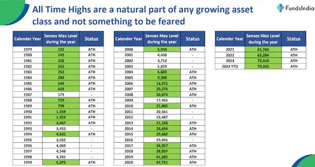 According to Jiral K Mehta, Senior Analyst at FundsIndia, all-time highs are a natural and expected part of long-term equity investing. Markets need to hit new highs to sustain growth. For instance, if Indian equities are expected to grow at around 12% per annum, the index will likely double in about six years, quadruple in twelve, and increase tenfold in twenty years. This inevitable growth trajectory involves surpassing several all-time highs.