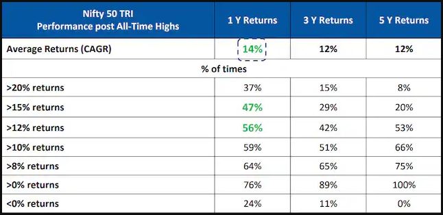 Historical Insights: FundsIndia’s research reveals that 57% of the time, one-year returns following an all-time high are positive. The average one-year return for investments in the Nifty 50 TRI during an all-time high has been approximately 14%. This suggests that market highs can be part of a broader upward trend rather than an immediate precursor to a downturn.