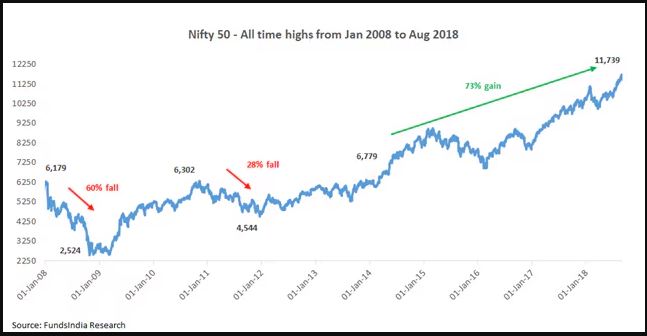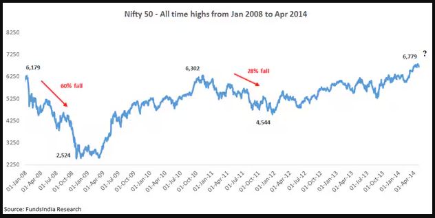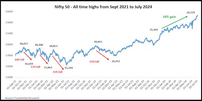 Historical Patterns: Historical patterns indicate that after periods of stagnation and repeated highs, markets often break out and continue to grow. For example, between 2008 and 2011, the Nifty 50 repeatedly hit the 6,000 levels but faced significant declines of up to 60% and 28%. However, contrary to previous patterns, the market surged by 73% in 2014 following a new all-time high.